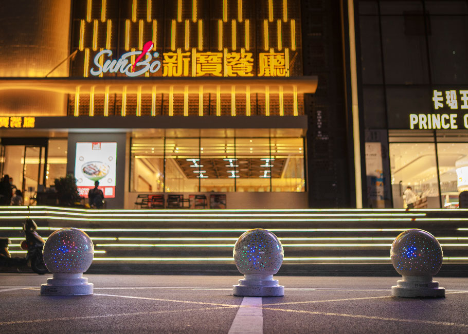 新型路障石材具有擋車功能,提升場所的形象和安全性,夜晚展現出特別絢麗的效果